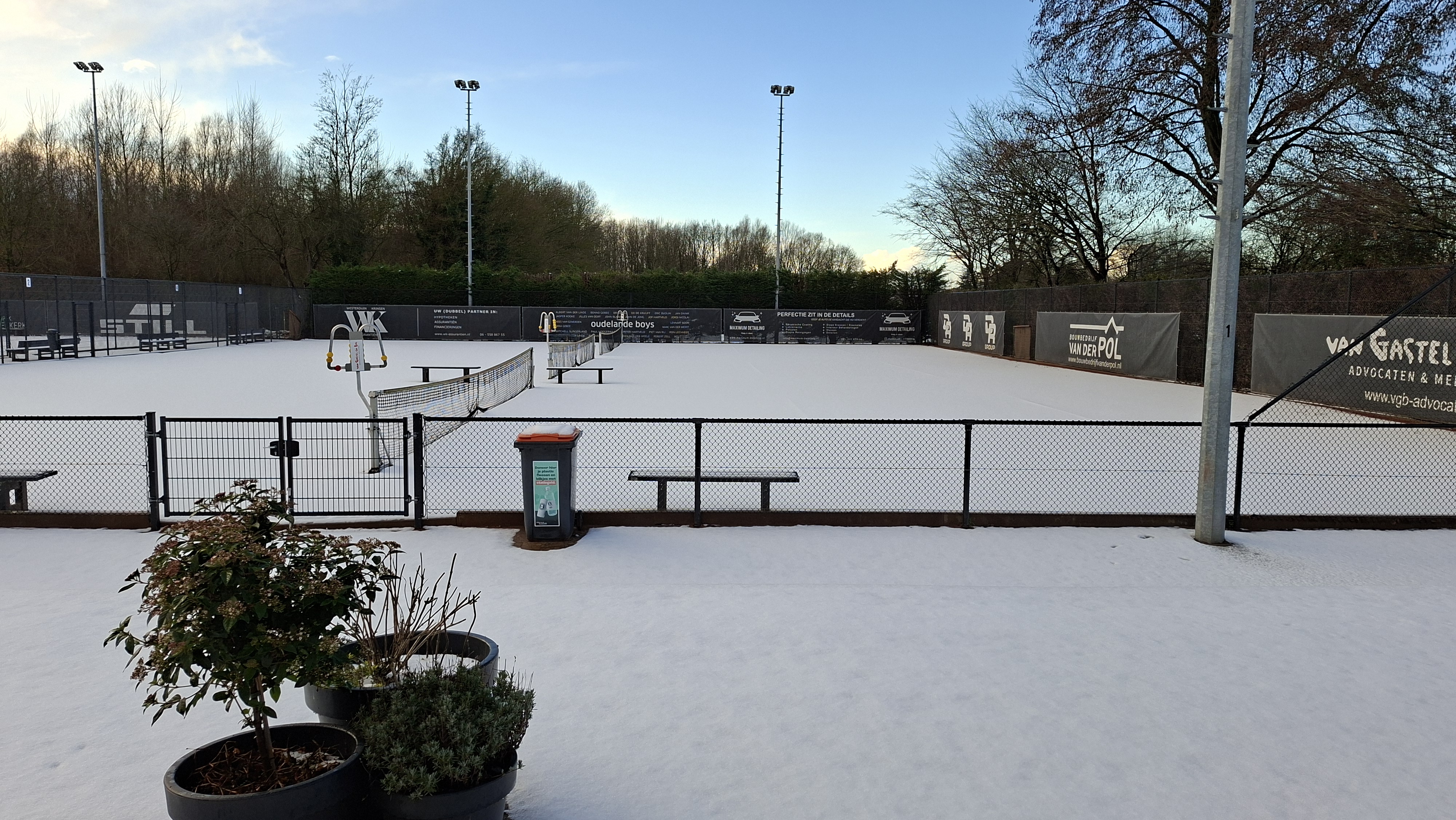 Alle banen zijn tot nader order gesloten omdat er een dikke laag sneeuw op ligt. Een mooi gezicht, maar tennissen is helaas niet mogelijk.