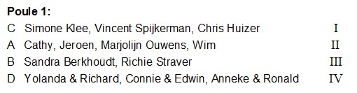 In poule 1 is het team van Simone, Vincent, Chris en Richie eerste geworden en in poule 2 hebben Frank en Marjolijn de eerste prijs gepakt. Allemaal van harte gefeliciteerd.