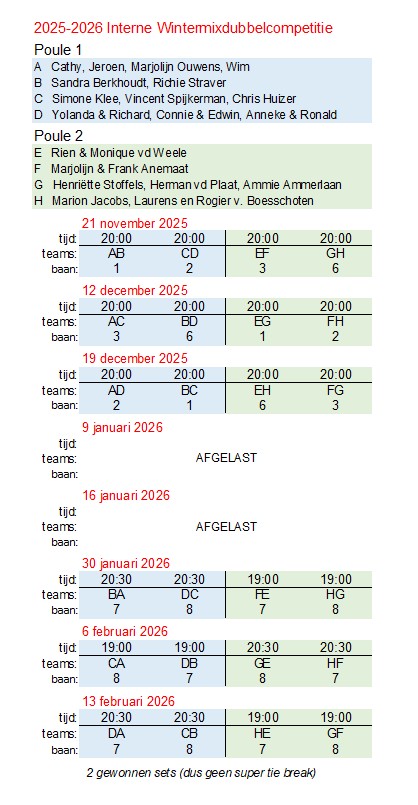 Update 29-01-2026: Interne Wintermixdubbelcompetitie 2025-2026 - let op de verschillende aanvangstijden!